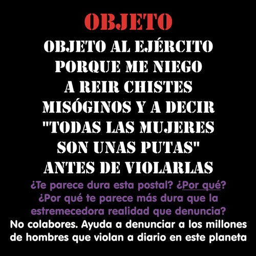 Objeto - crítica al movimiento antimilitarista, que no nombra la cuestión de la violación allí donde también podría ser nombrada, entre las razones a objetar