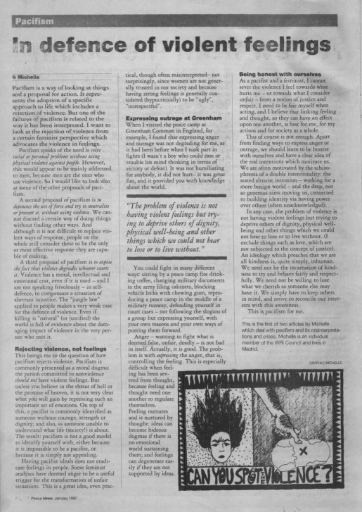 Como pacifista y feminista, no puedo desgajar mi violencia interior frente a lo que me hace daño, y frente a lo que considero injusto, de la idea de justicia y respeto. Porque necesito ser justa cuando actúo y creo que vincular la emoción y las ideas, para que puedan influir una en las otras y viceversa, es mejor para mí, para mis acciones y para la sociedad en general.