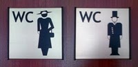 Este par de carteles es interesante, porque aparentemente puede no ser evidente al espectador moderno que la persona representada en el cartel del baño de hombres es, en realidad, un hombre.