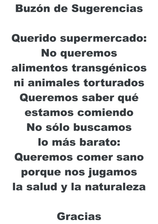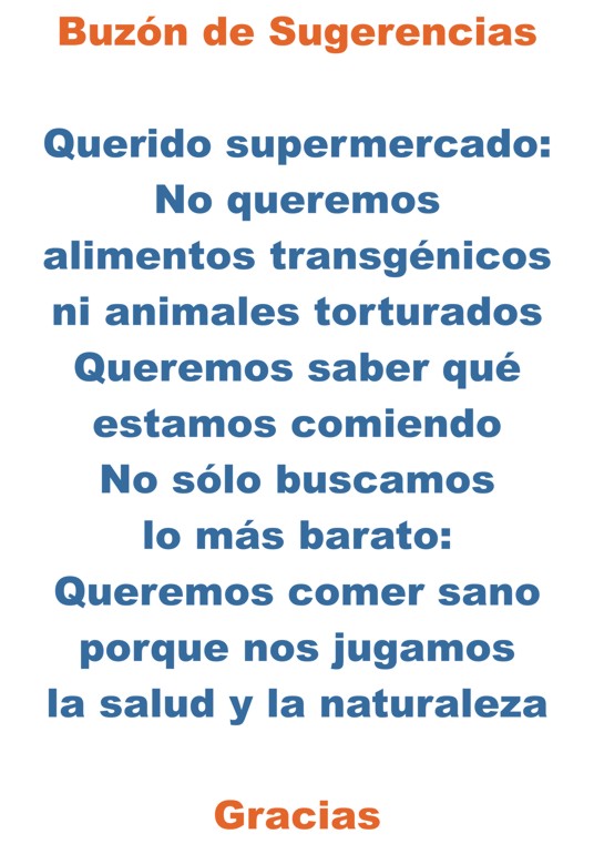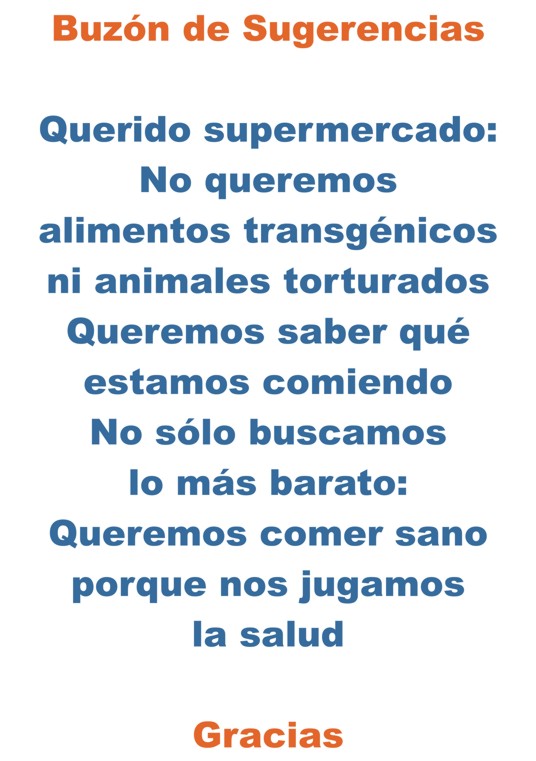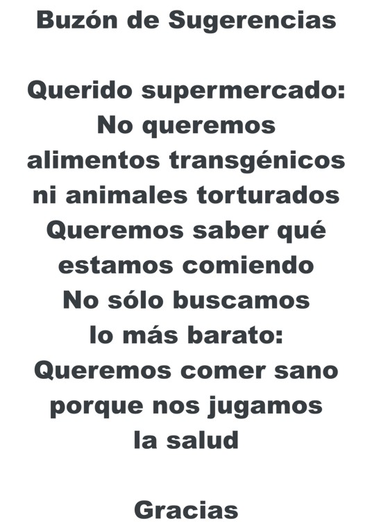 Contenido del texto en 1 y 2: Buzón de sugerencias. Querido supermercado: no queremos alimentos transgénicos ni animales torturados. Queremos saber qué estamos comiendo. No sólo buscamos lo más barato. Queremos comer sano porque nos jugamos la salud. Gracias