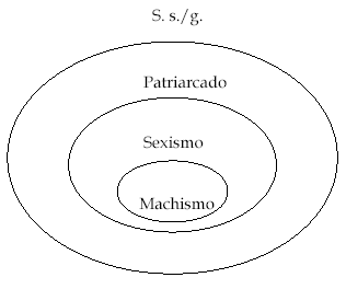 Una tarea difícil, pero necesaria, parece ser aquí la de distinguir el concepto de machismo de otros afines. De especial relevancia nos parece la distinción que hace Victoria Sau en su Diccionario Ideológico feminista (2000) entre machismo y sexismo. Para esta autora, “el machismo lo constituyen aquellos actos, físicos o verbales, por medio de los cuales se manifiesta de forma vulgar y poco apropiada el sexismo subyacente en la estructura social. En el terreno sexual, por ejemplo, estos actos pueden ir desde el piropo hasta la violación, según los individuos. El machista generalmente actúa como tal sin que, en cambio, sea capaz de <<explicar>> o dar cuenta de la razón interna de sus actos. Se limita a poner en práctica de un modo grosero ( grosso modo ) aquello que el sexismo de la cultura a la que pertenece por nacionalidad y condición social le brinda”. En relación al patriarcado, tendríamos que definirlo como el imaginario social, el conjunto de “verdades rectoras” del S. s./g que contiene estos tres subsistemas (patriarcado, sexismo y machismo). De modo gráfico, esto podría representarse de la siguiente manera: