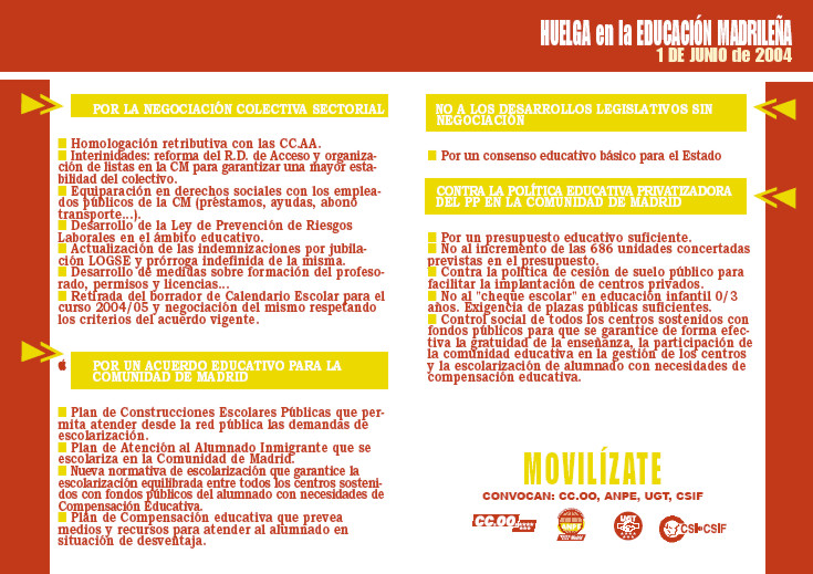 Nota desanimada de agosto 2005: Las y los profes están amuermaos, o algo. Propusimos una idea que podía ser factible y muy buena, y na. La actividad En defensa de la enseñanza pública (localizable en la sección Proyectos, apartado Pensamiento crítico). Los profes son piedras clave en la secundaria de la pública pero no se organizan para luchar por la enseñanza pública, y eso que les han puteado de lo lindo, multiplicando sus funciones, lo que nos llevará a quedarnos sin profes dentro de unos años, como les ha pasado en otros países... Es desanimante, la verdad.